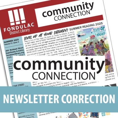 We made an "oops": the Summer 2025 edition of our quarterly Community Connection newsletter implies that we are open on Sundays, May to September. We are actually closed on Sundays, June to August. We are open 1 p.m to 5 p.m. on Sundays, September through May. The corrected version can now be found on our website.
